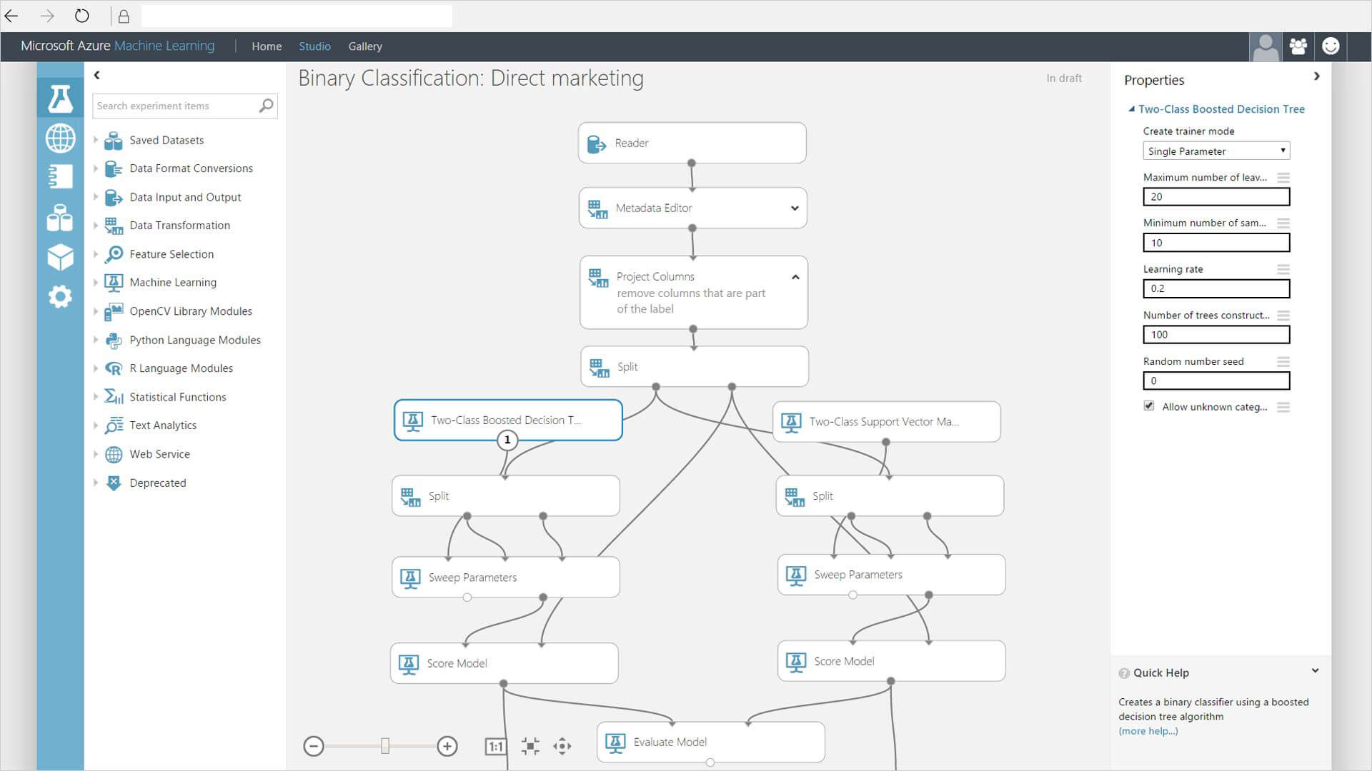 - El diseñador de Azure Machine Learning, provisto de módulos de arrastrar y soltar para crear sus experimentos e implementar canalizaciones.